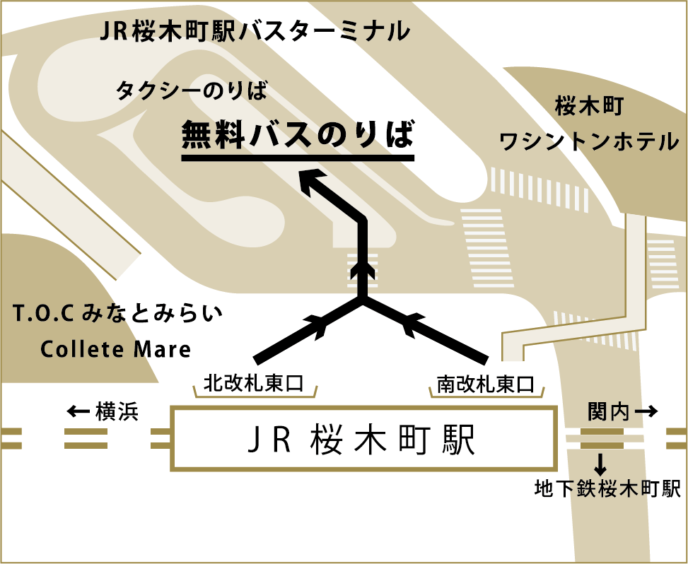 • JR「桜木町」駅(南改札西口、北改札西口)・市営地下鉄「桜木町」駅(南1番出口)から徒歩10分